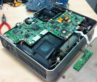 In the image on the right you can see the projected image has no snow storm effect any more. In this case we removed and replaced the DMD chip.